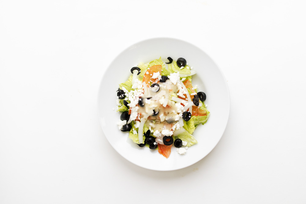 Refreshing and flavourful salad featuring fresh ingredients like romaine lettuce, tomatoes, onions, sliced black olives, and feta cheese, all with a greek salad dressing on the side